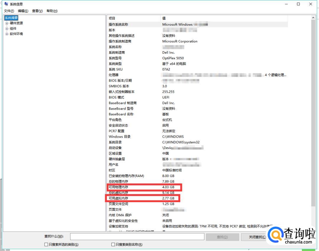 在系统信息界面中,就可以看到你的电脑还有多少内存可用。