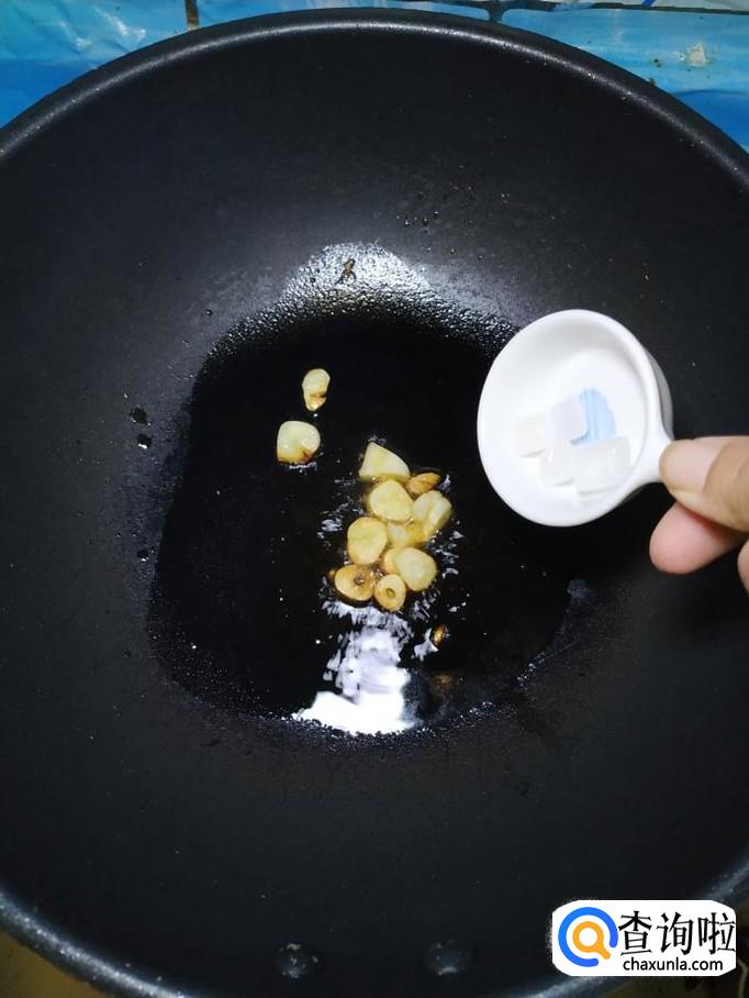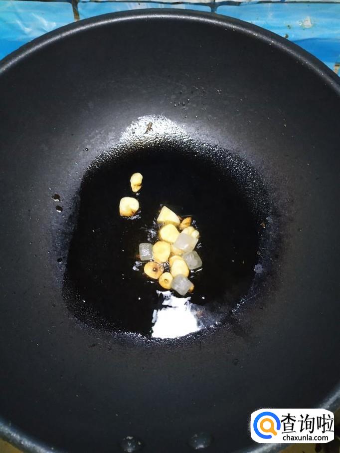 准备适量蒜,去除外衣后,切成片儿,炒锅中放入适量油,油热后,将蒜片放入锅中炒香,再准备适量冰糖,放入锅中,小火慢慢熬出糖色。