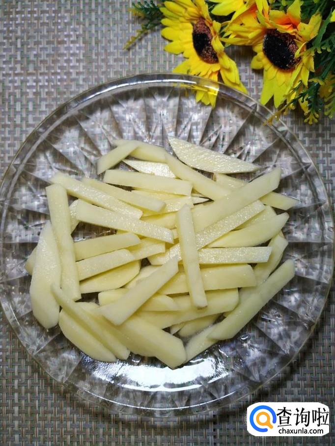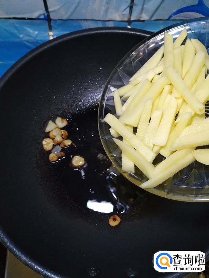 将准备好的土豆条,控干水分,倒入锅中,小火慢煎,土豆很快就粘上一层焦糖色。