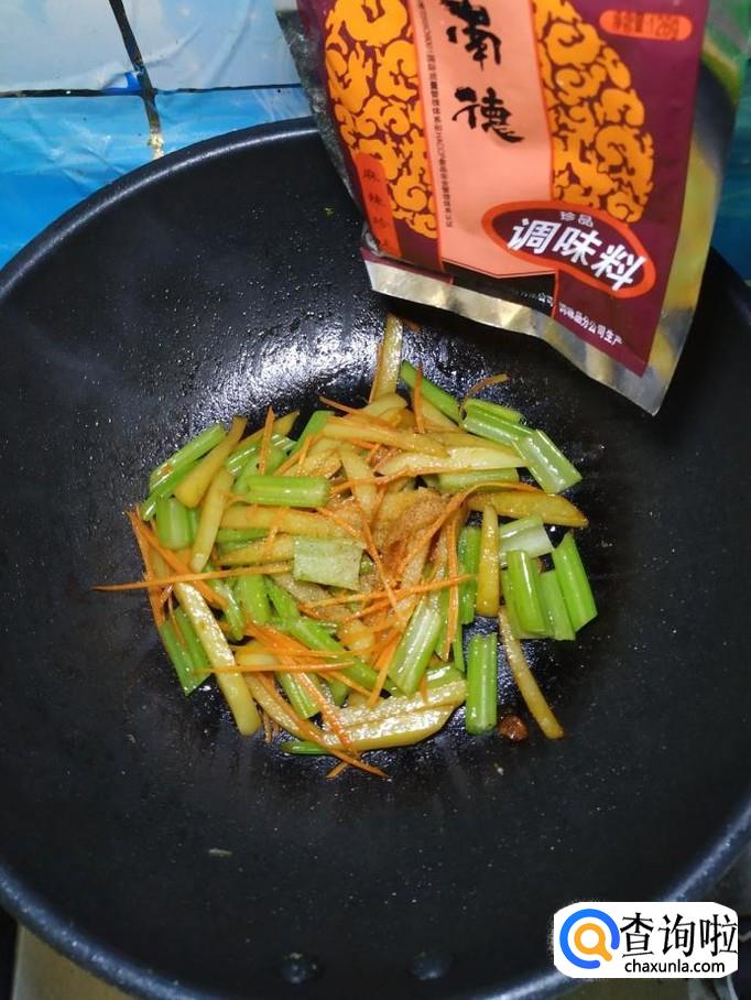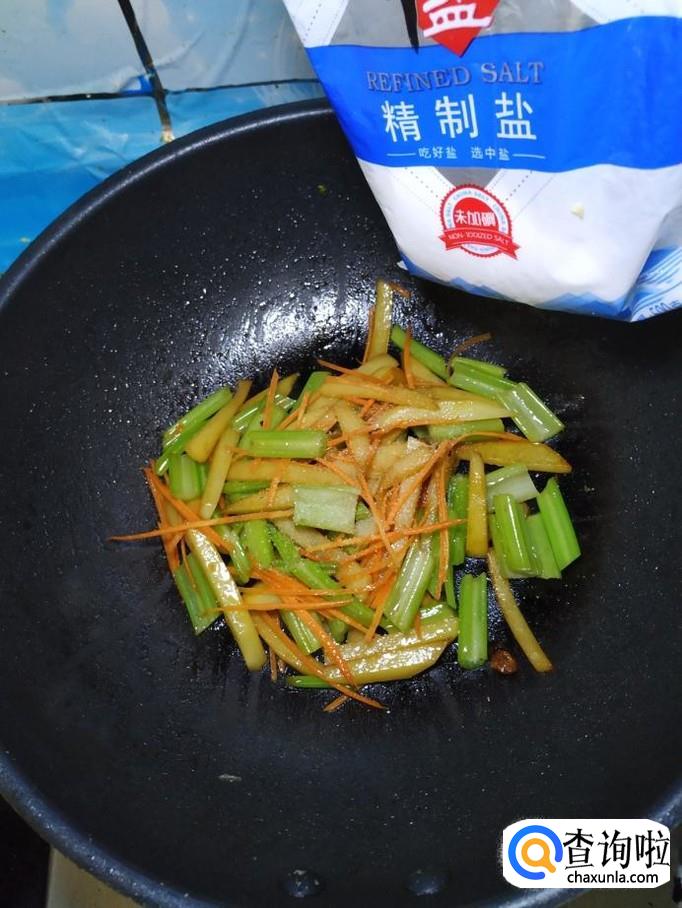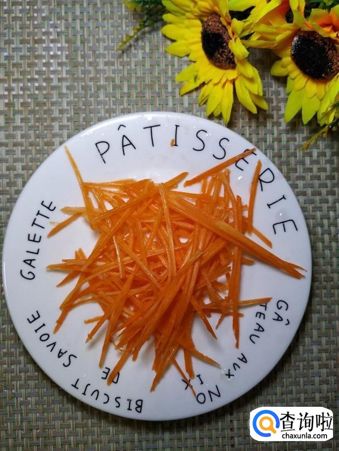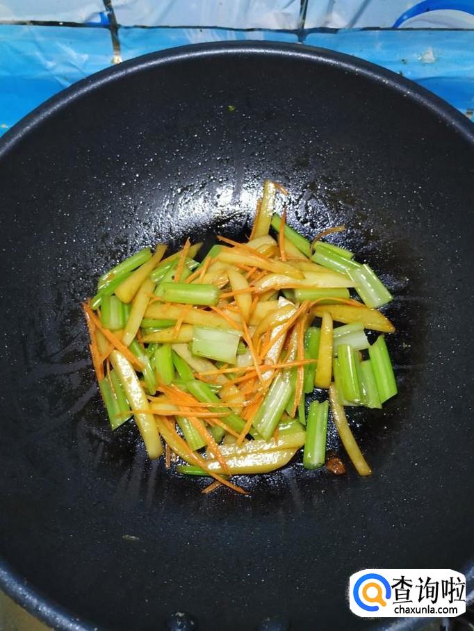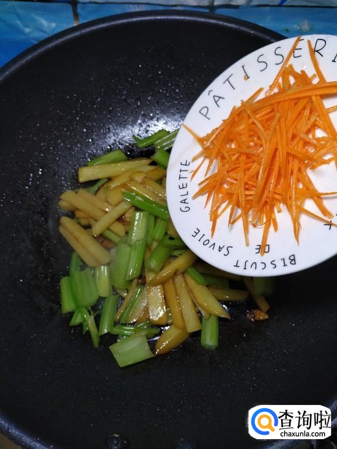 将胡萝卜丝,倒入锅中翻炒均匀,胡萝卜不仅营养,而且可以让菜肴的色泽更加好看。
