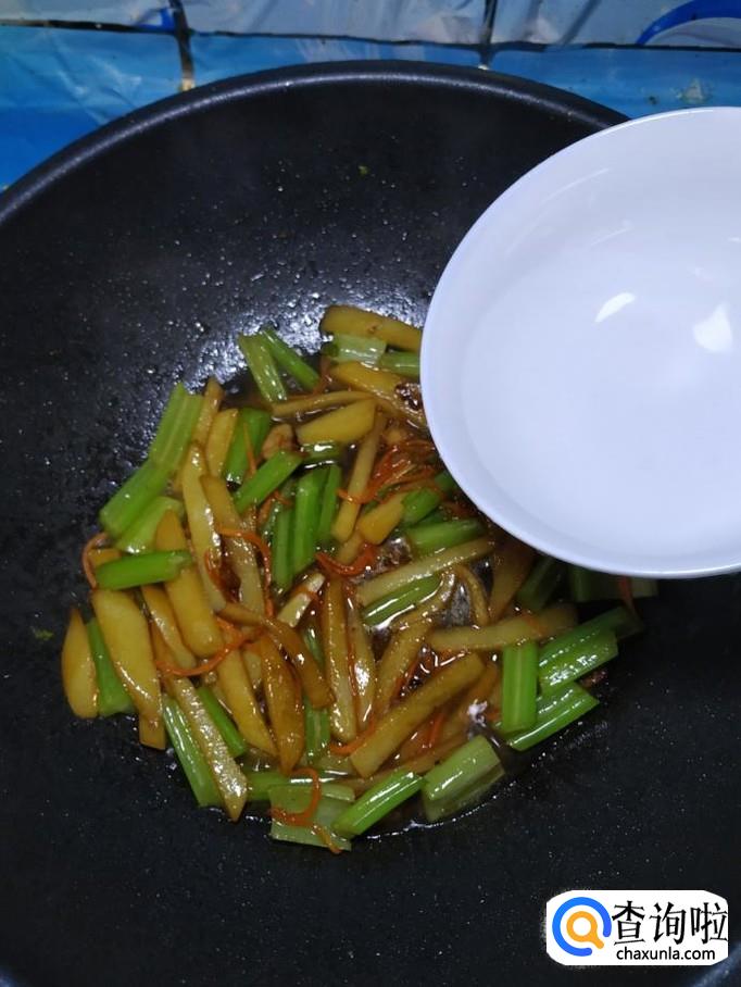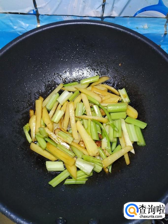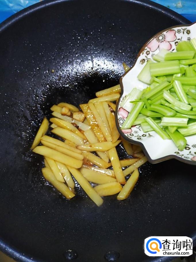 炒至土豆五成熟后,再将切好的芹菜段,放入锅中,和土豆一起翻炒均匀。