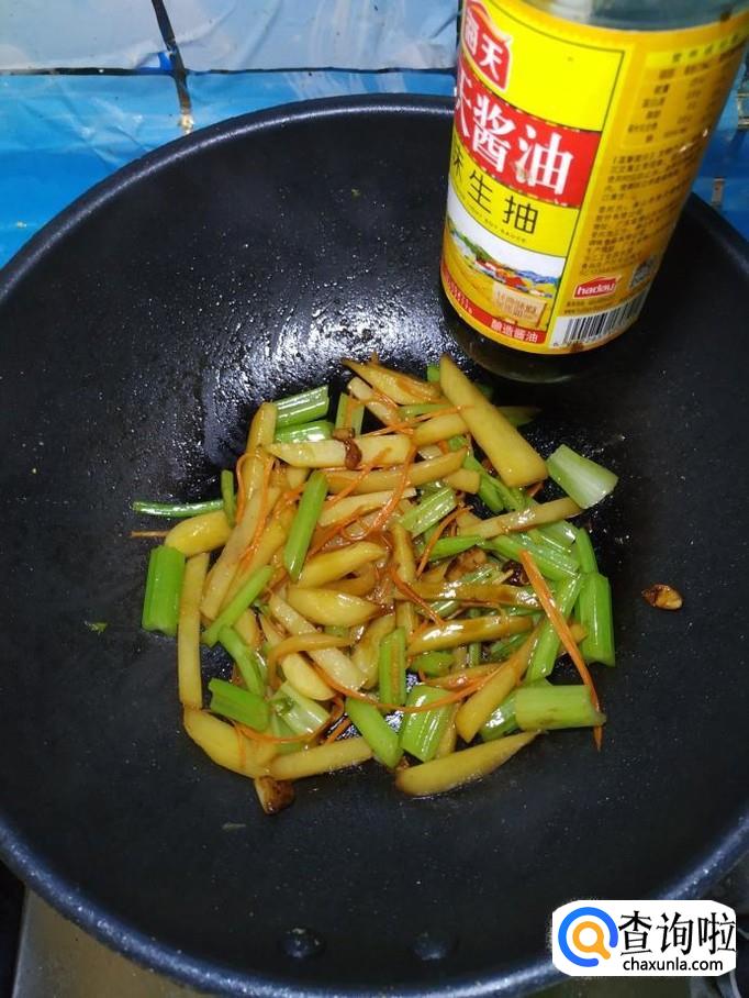 加入适量生抽,生抽可以让菜肴的色泽更加好看,再加入少许清水,焖两三分钟,出锅前加入适量陈醋提鲜。