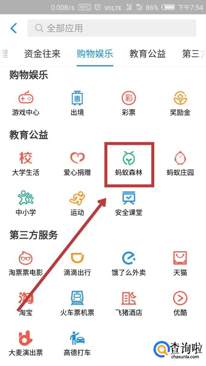 然后一直向下翻,在【教育公益】下面找到【蚂蚁森林】,点击进入。