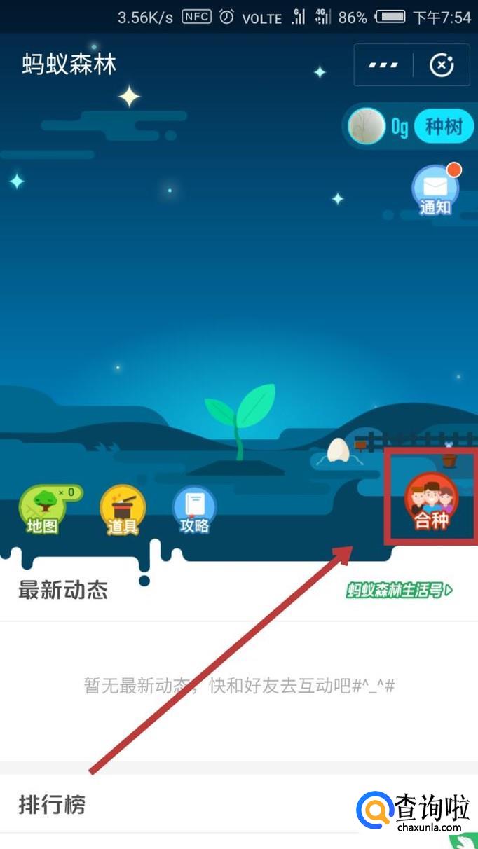 在【蚂蚁森林】界面的右侧有一个红色的【合种】的图标,点击进入。
