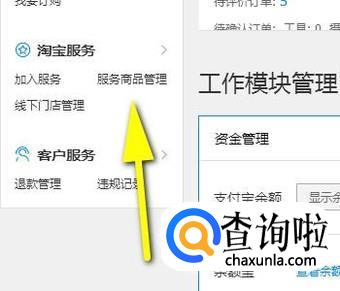 我们看左侧这里的功能导航;向下翻动页面,找到“淘宝服务”;再从这里点击:服务商品管理