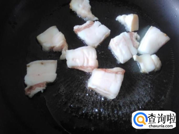 开火,下少量的油,【要下点油才可以炸出肥肉里面的油出来】把半瘦肥肉放进去煎到焦黄色,炸出油来。