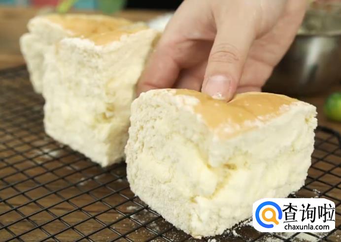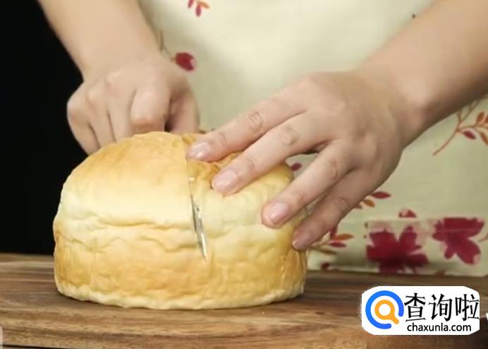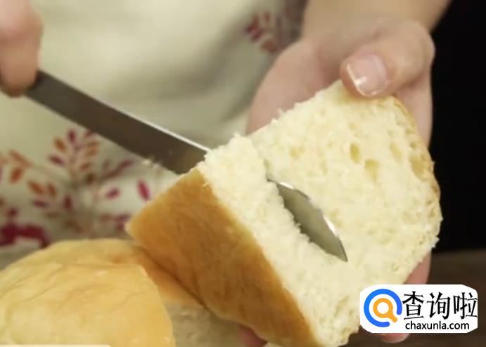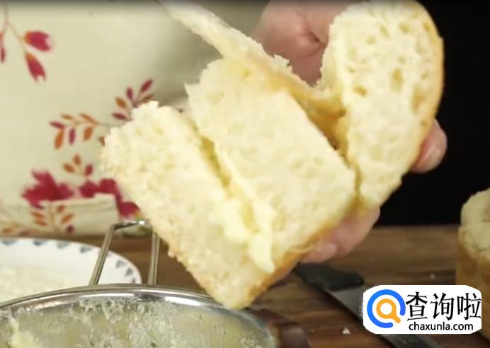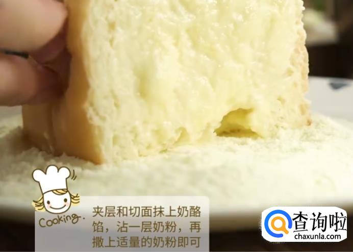 面包一切为四,横切两刀,夹层和切面抹上奶酪馅。