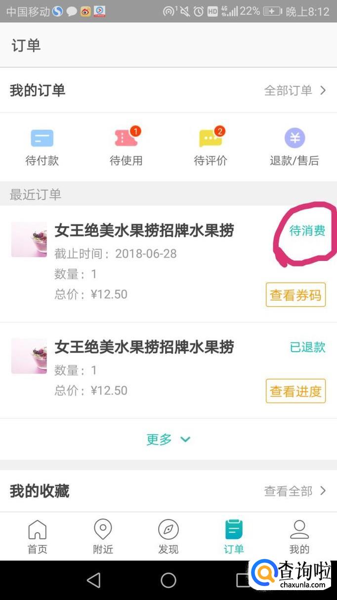 首先找到你下的订单,可以看到显示待消费,这就说明可以取消订单,点击待消费,如图。