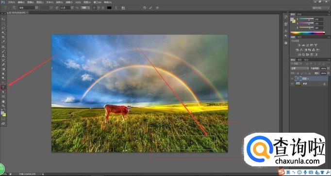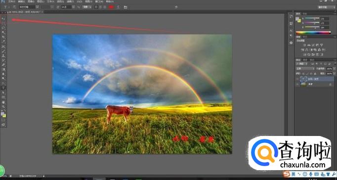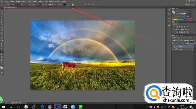 确认打开图片后,被选中图片便会出现在PS界面上,此时我们选择“文字工具T”,并在图片上的合适区域划出一个文本框(鼠标左键按住不放在图片上拖动)用以添加文本。