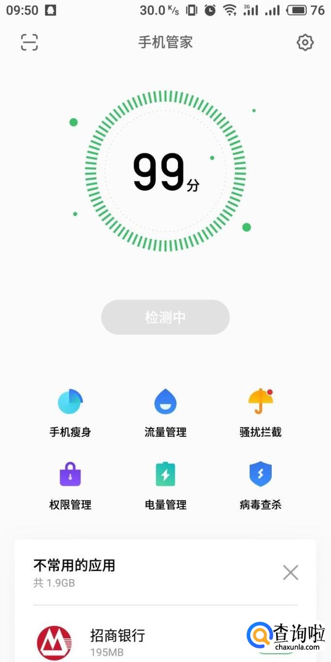 进入手机中的手机管家界面,在界面中选择“权限管理”