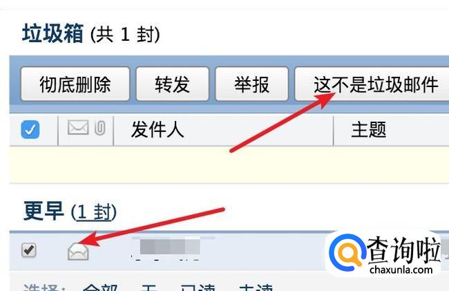 然后点击选中被错误拦截的邮件。再点击上方的‘这不是垃圾邮件’按钮。