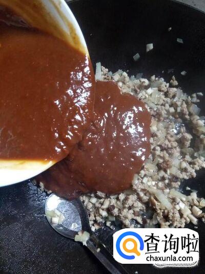 起锅热油,油热以后放入洋葱、香菇炒香,之后倒入甜面酱,一直搅拌。