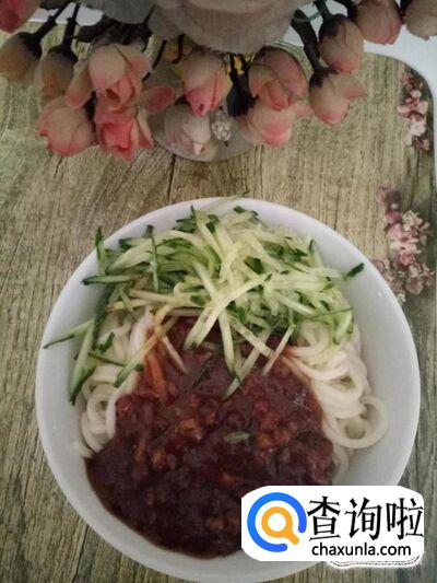把面条盛到碗内,舀两勺之前炸好的酱,再放一根黄瓜丝,一碗香喷喷的炸酱面就做好了。