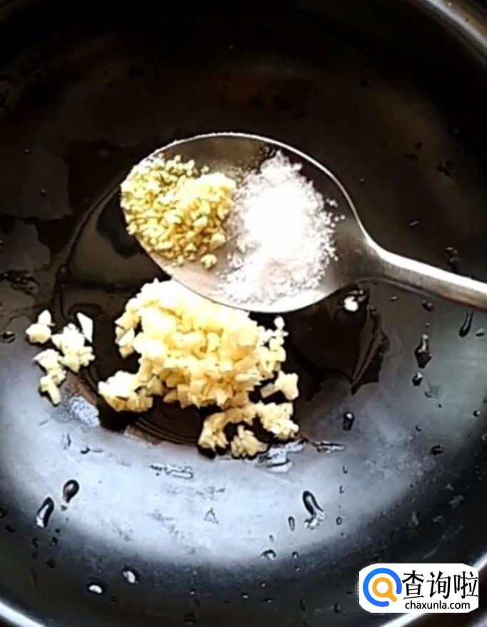 然后我们在一个碗中放入适量的蒜末,再放入盐,鸡精,胡椒粉调味