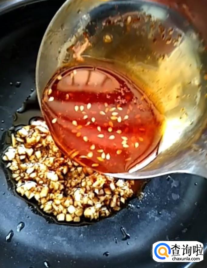 接着我们再倒入适量的酱油,陈醋,再把一勺辣椒油浇在上面