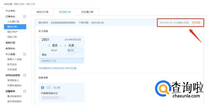 支付成功后,可在我的12306→订单中心→候补订单→待兑现订单中查看。候补订单的右侧会显示截止兑现时间及兑现状态。