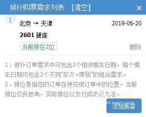 1个候补订单,最多可以添加2个相邻乘车日期的2个不同“车次+席别”的组合。