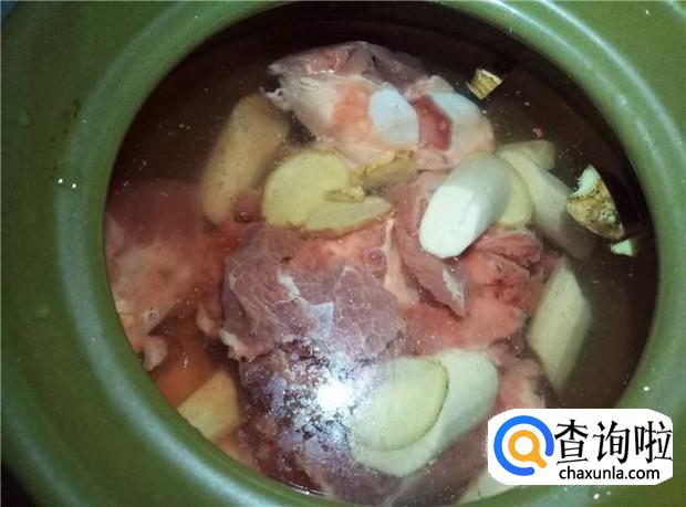 把清洗干净的筒骨、淮山,和姜片一起放入汤锅里煮。