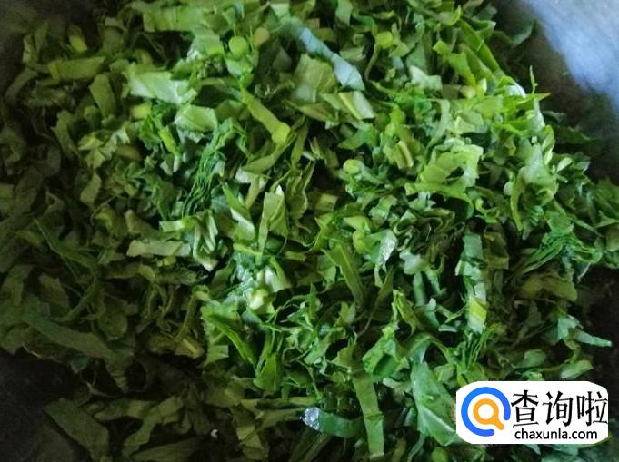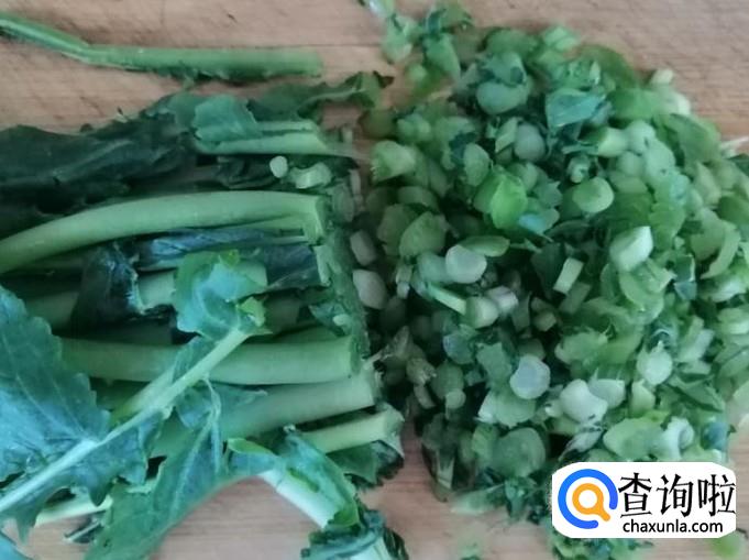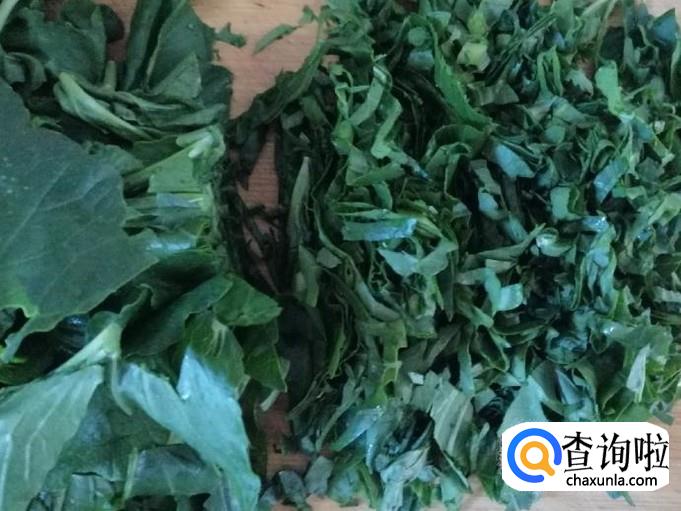 选新鲜的萝卜叶子适量,用清水洗净控水,分出硬干和叶子单放,因为叶杆那部分不好熟,洗净后挑出来,切的时候如图杆部分经量切细,最后切纯叶子,叶子不用切很碎如图所示就可以。