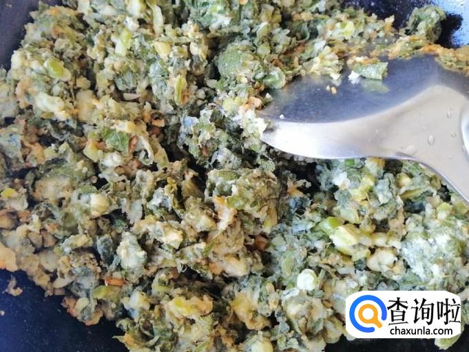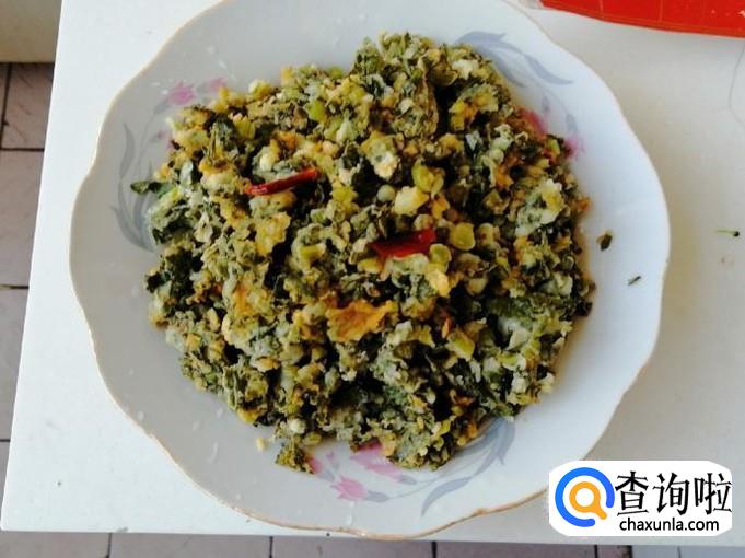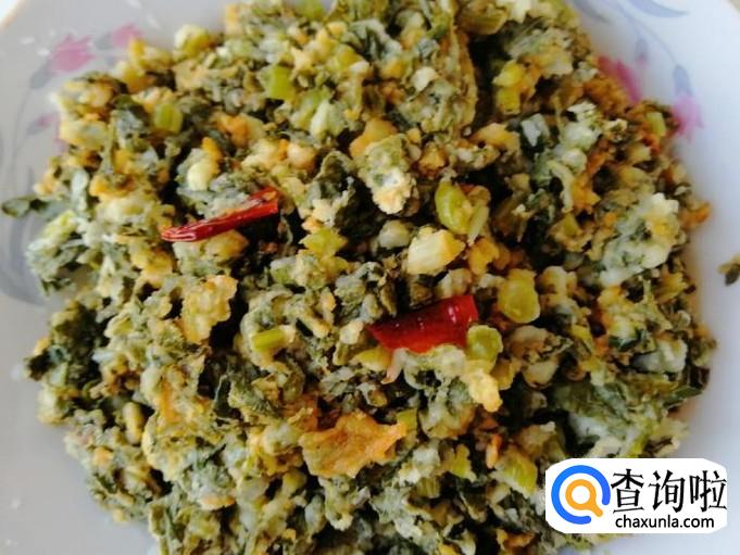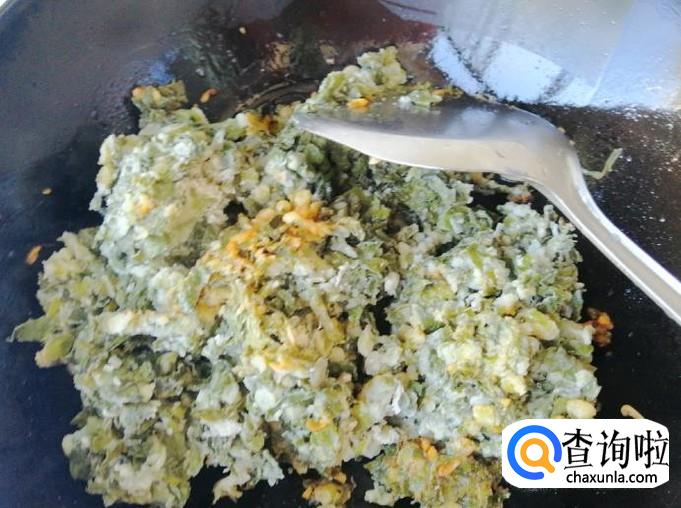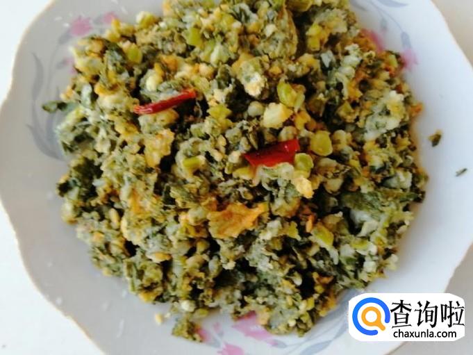 很快蒜醋辣椒的香味就扑鼻而来,这时改大火,快速放入蒸好的萝卜叶子,翻炒均匀,看着菜变色,接着再关小火继续翻炒,直到让所有蒸菜都均匀粘上所放的料。