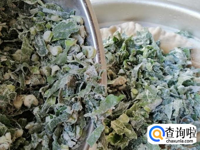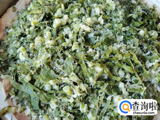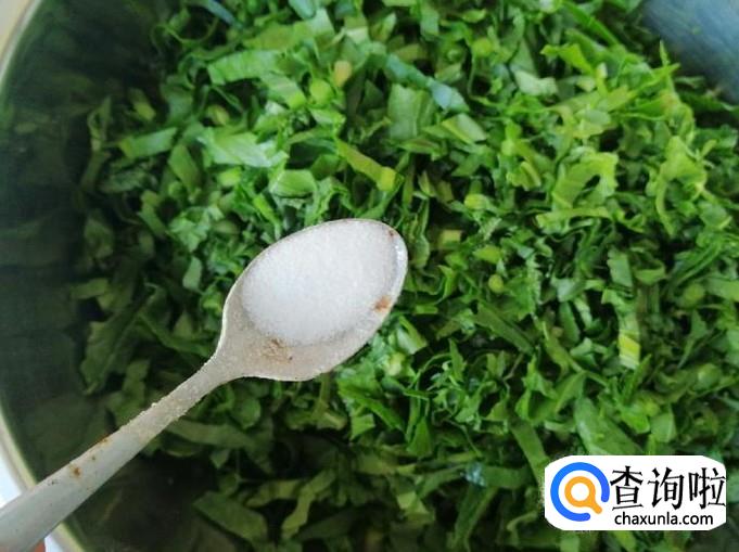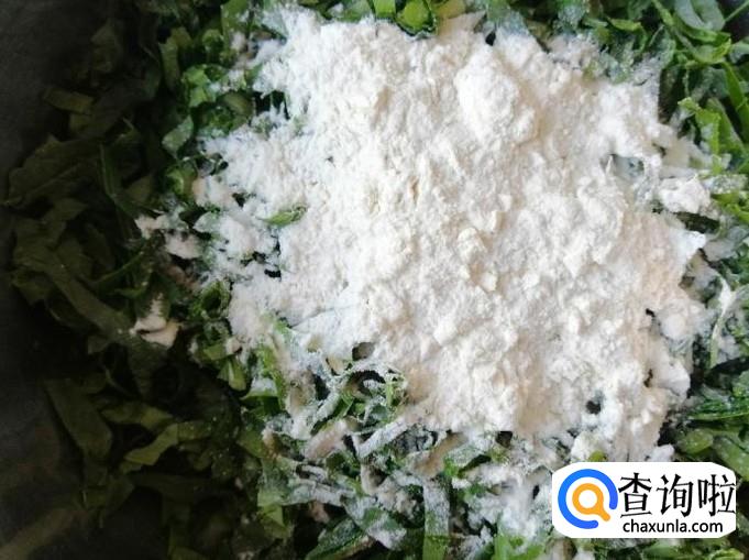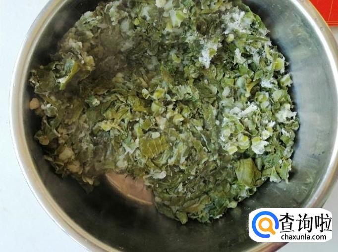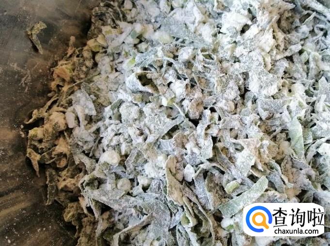 把洗净切好的萝卜叶子放入容器中,先加适量食盐搅匀,稍微放置一会,然后加入适量干面粉,这里所用面粉不要加很多,因为菜是控干水份的,加入面粉后用筷子搅拌均匀待用。