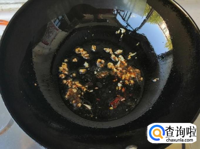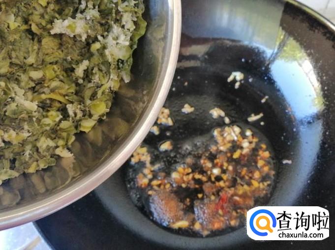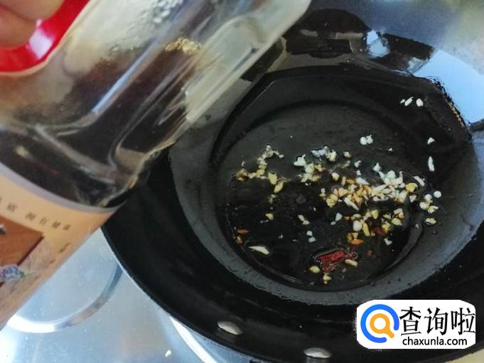 这一步我们就准备开炒萝卜叶子,开火炒锅放油,油热后先用蒜末和辣椒炝锅,炒出蒜香味后,把火关小,这时可以加入适量香醋,生抽少许,因为火大时加这些东西很容喷出来,都加好量后下一步就该放入蒸好的萝卜叶子了。