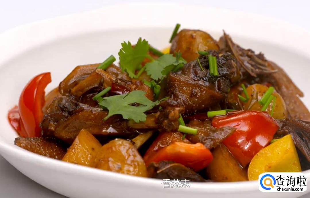 煮到鸭肉香韧,土豆酥软,加辣椒块点缀下出锅,撒上葱花和香菜末即可。