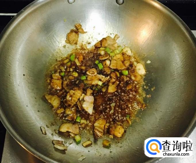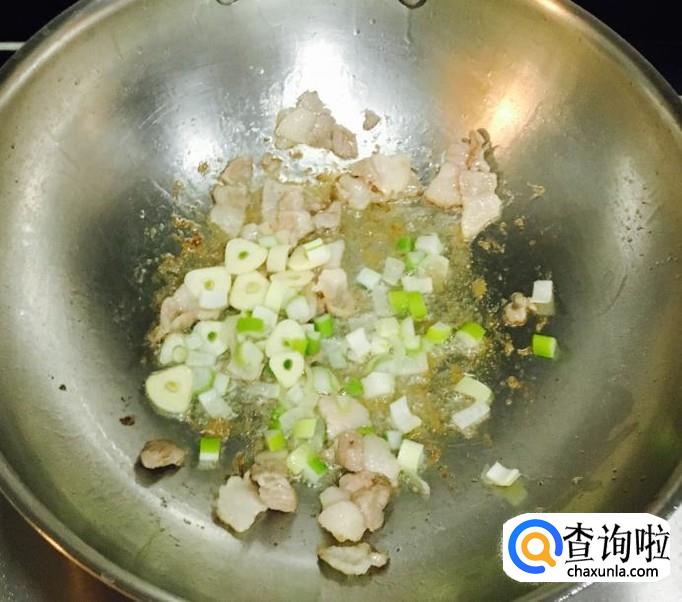 热锅加入适量的花生油把五花肉片炒出香味,放入葱花、蒜片爆香,料酒、生抽烹锅