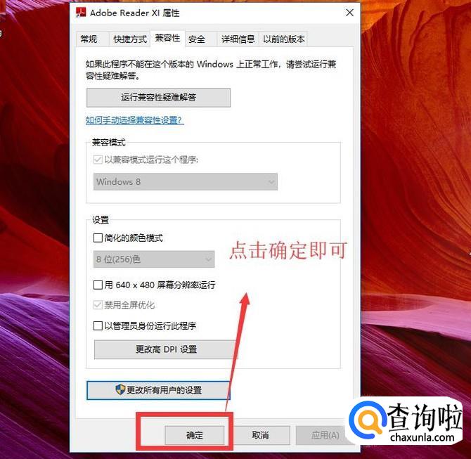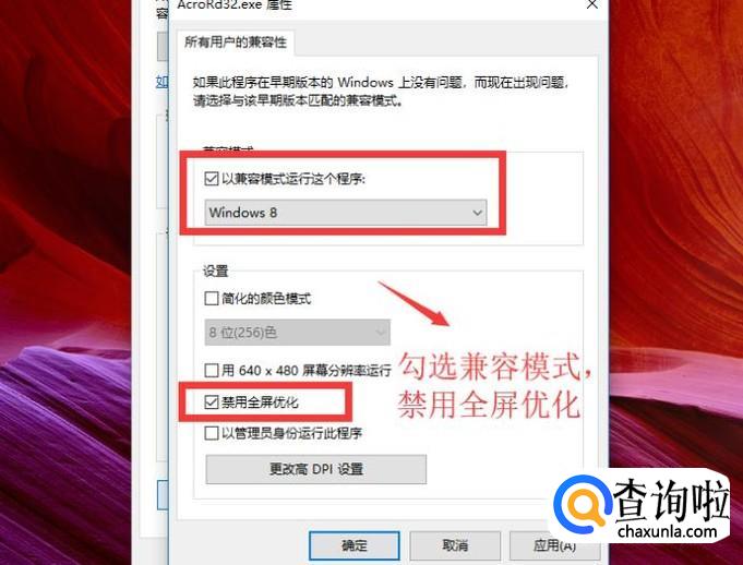 然后在所有用户兼容性界面勾选兼容模式的复选框并兼用全屏优化,如下图所示