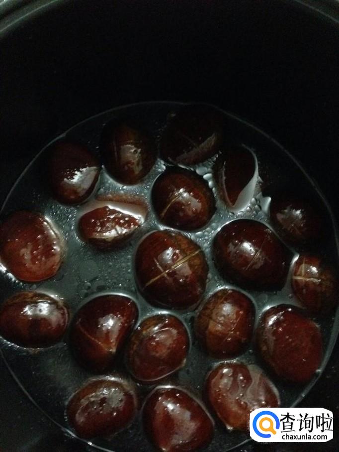 放好材料后加盖,按下煮饭开关,开始煮栗子等电饭锅跳起保温时,看一下时间大约3-5分钟就可以了,这样香甜的栗子就做好了。