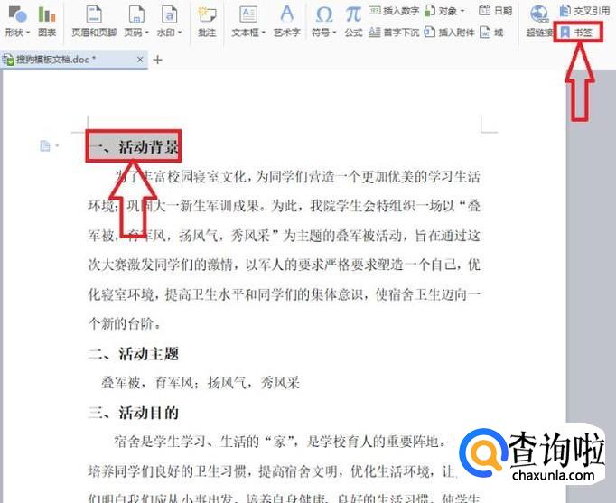 首先在文章中找到目录所列的标题,选中所找到的标题,点击“书签”选项,如下图