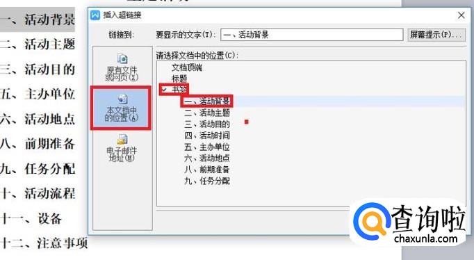 在弹出的超链接选项卡中,选择“本文档中的位置”在“书签”中找到“一、活动背景”,选择后点击“确定”即可