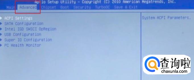 然后使用键盘上的上下左右按键移动到“Advanced”回车进入,然后再选择“SATA Configuration”,回车进入,如图: