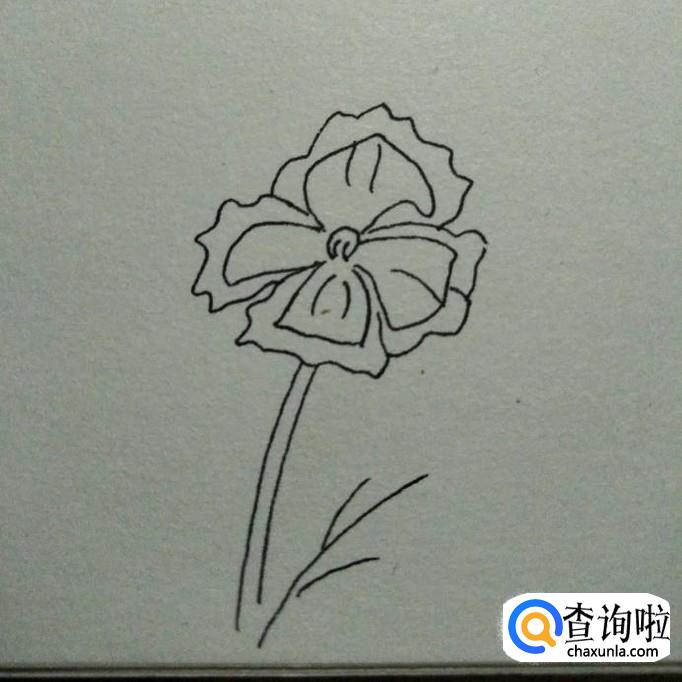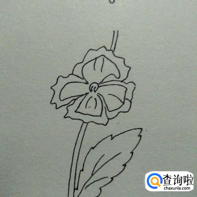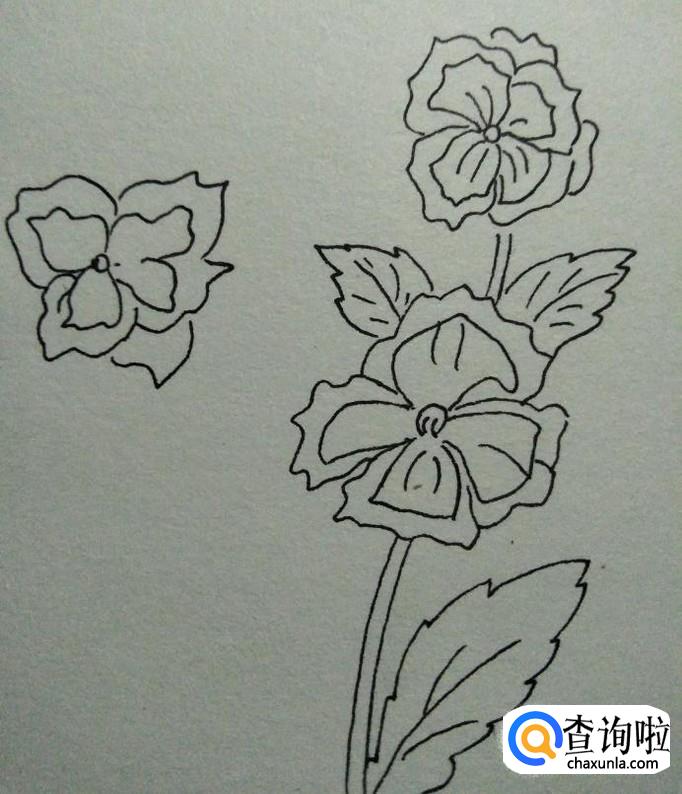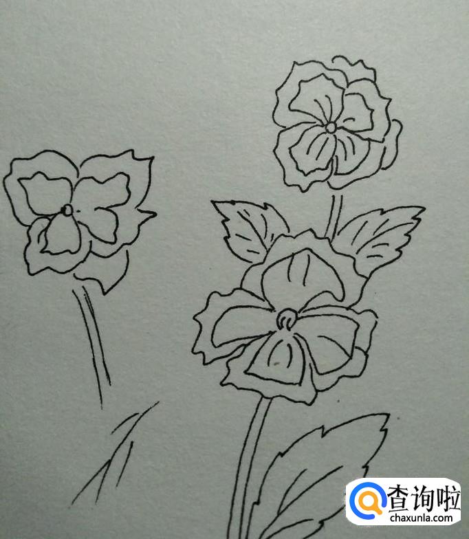 再在刚刚两朵花的左边画出一朵类似的花,具体的样子可以根据个人的喜好,你可以依据自己的想象来画花朵此时的姿态,然后画出花杆部分,接下来按下图3所示的样子画出四片花叶