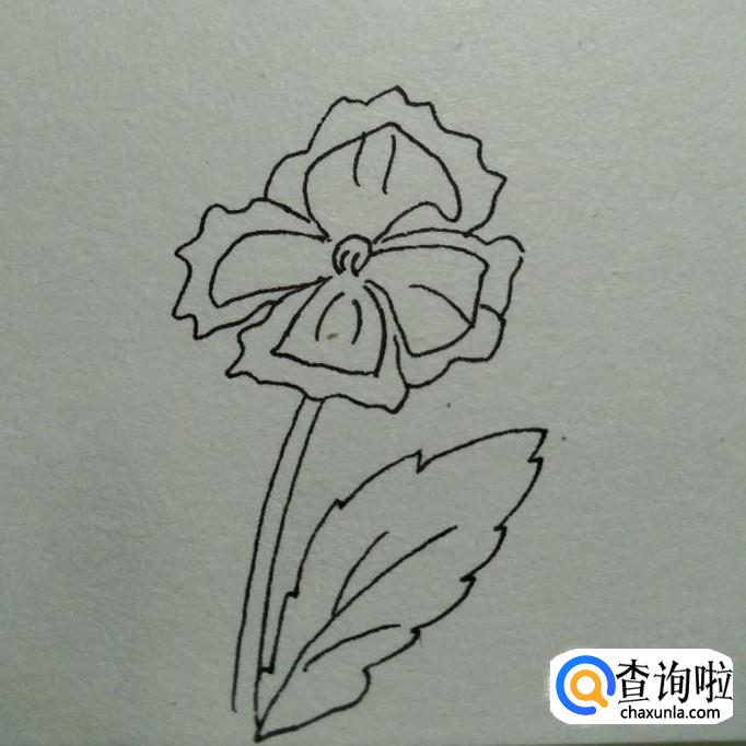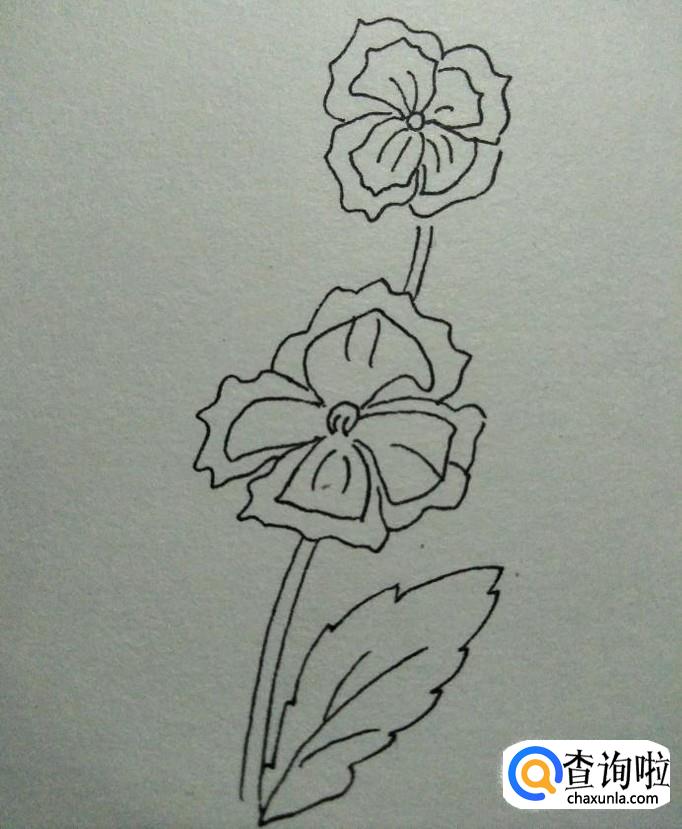 在刚刚这朵花的上面再画出一朵类似的画,如下图一所示,然后,在之前那一朵花的上面,画出左右两片叶子