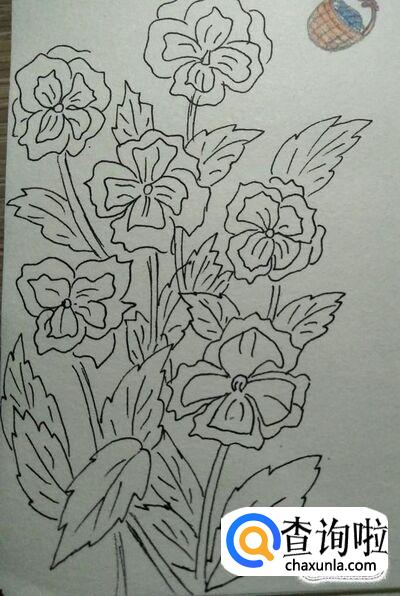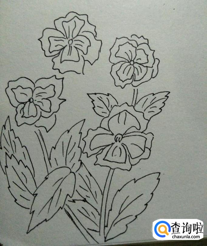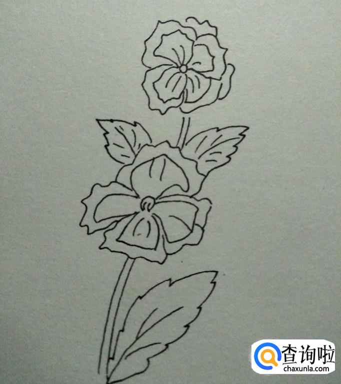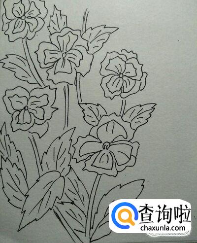然后,比较随意的画几片叶子,按照如下图所示的方法在画两朵花,几片叶子