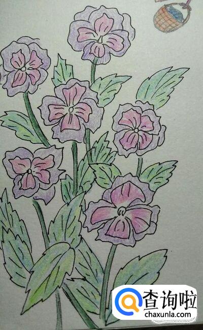 然后我们给花朵上色,花杆部分涂成深绿色,花叶涂成浅绿色,外围的花瓣涂成淡紫色,花瓣涂抹时用蜡笔顺着花瓣的尖部往内顺着涂,使花瓣看起来有一种自然的美感,然后内部花瓣涂成蔷薇色,涂抹的方法刚刚一样,再用黄色的蜡笔,涂抹花芯。
