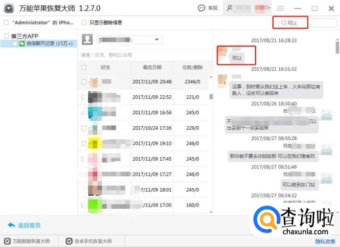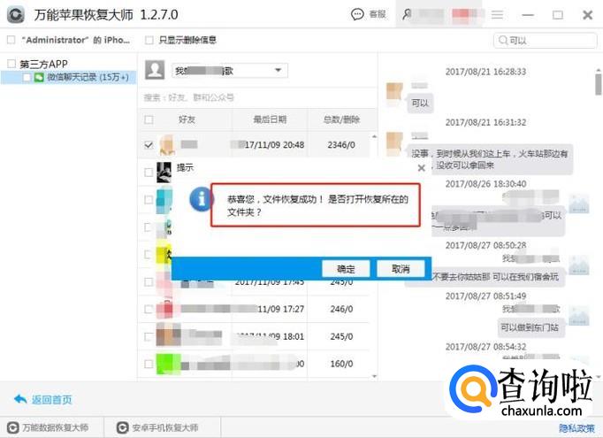 找到要的聊天记录后,点击下方的恢复按钮,将苹果手机删除的微信聊天记录以文本的形式保存到电脑上。