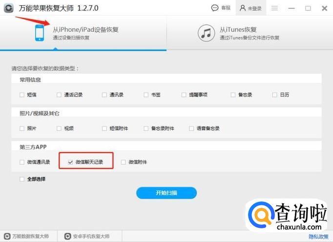 在界面上可以看到有【iPhone设备扫描恢复】和【iTunes备份恢复】,这里我们直接选择从iPhone设备扫描恢复。记得要将手机使用数据线连接到电脑上,这样软件会自动识别连接上手机后,会弹出数据类型选择界面,在界面上选择【微信聊天记录】,点击开始进入下一步。