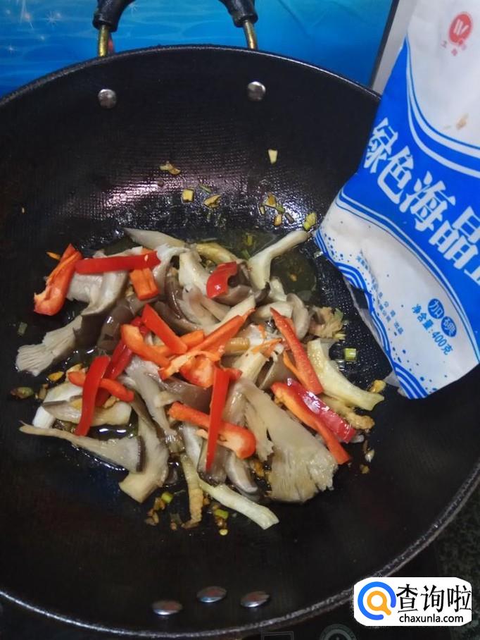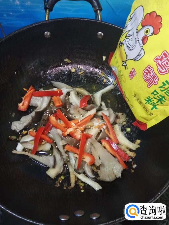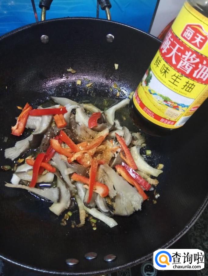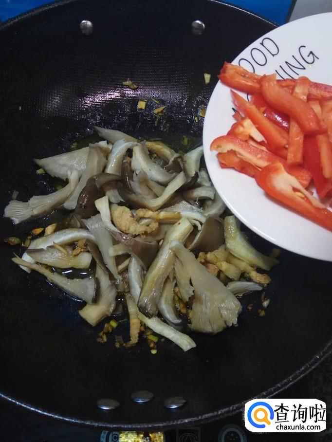 将平菇和红椒放入锅中,翻炒均匀。