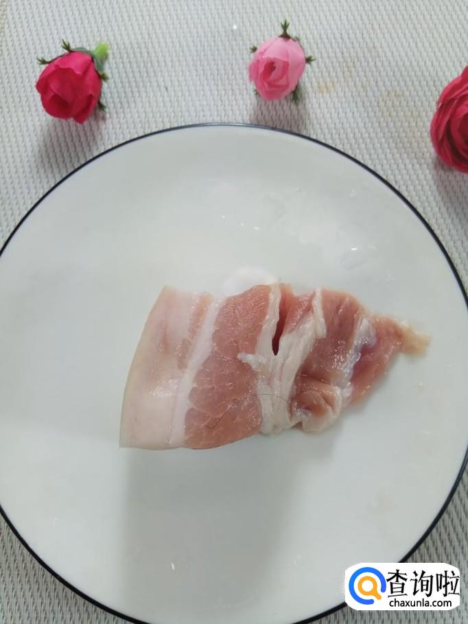准备适量五花肉,洗净后,切成条,放入盘子中备用。