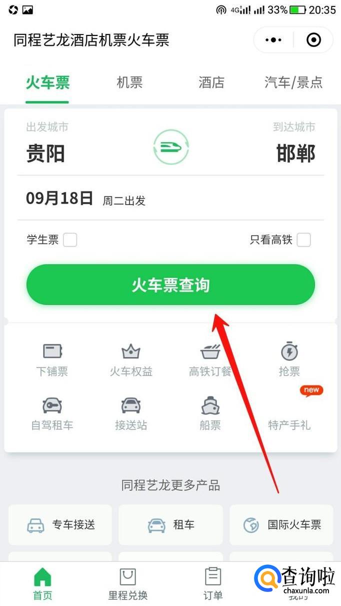 输入你的出发点和终点,点击火车票查询。