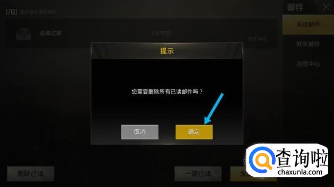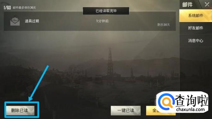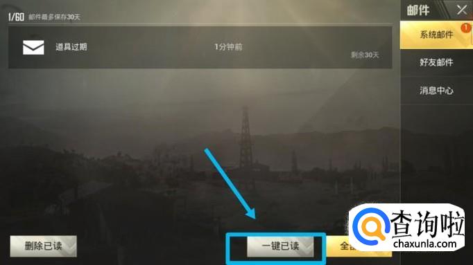 作为一名吃鸡的玩家,小编进入游戏的时候总会先看一下邮件,点击进入后如果没有重要的消息话,我会在游戏下方点击“一键已读”。如图所示。