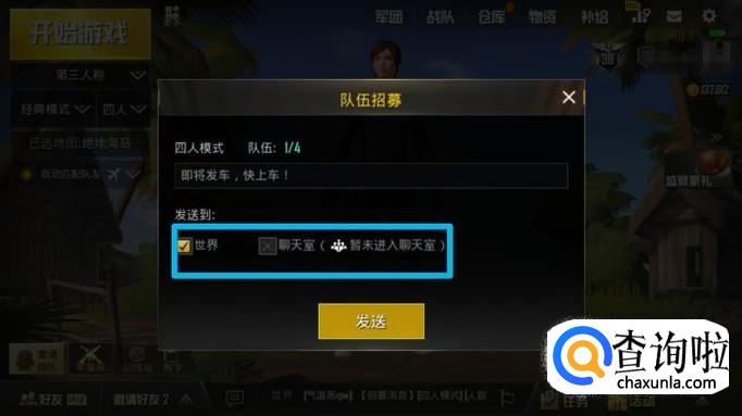 吃鸡自己的技术太差,我们可以邀请大神组队,带自己,在主页面点击小旗“邀请组队”输入要求,选择发送页面,发送即可。