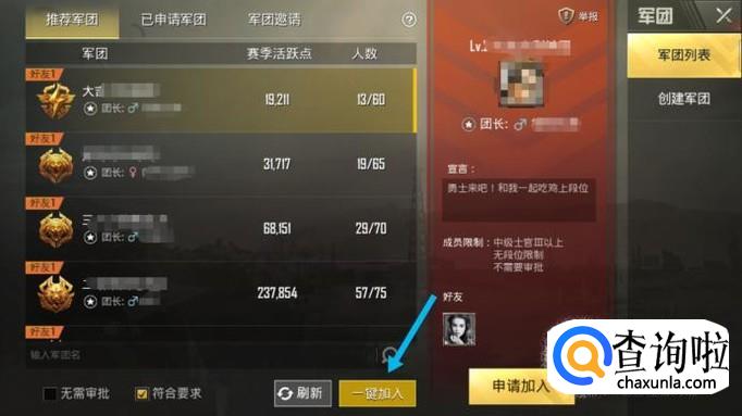 一个人孤军作战太脆弱,不如加入军团,但军团太多不知怎么选,我们可以在军团页面点击“一键加入”,系统会为我们匹配适合自己的军团。