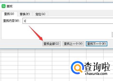 然后输入查找内容,点击查找全部。(以数字1为例)