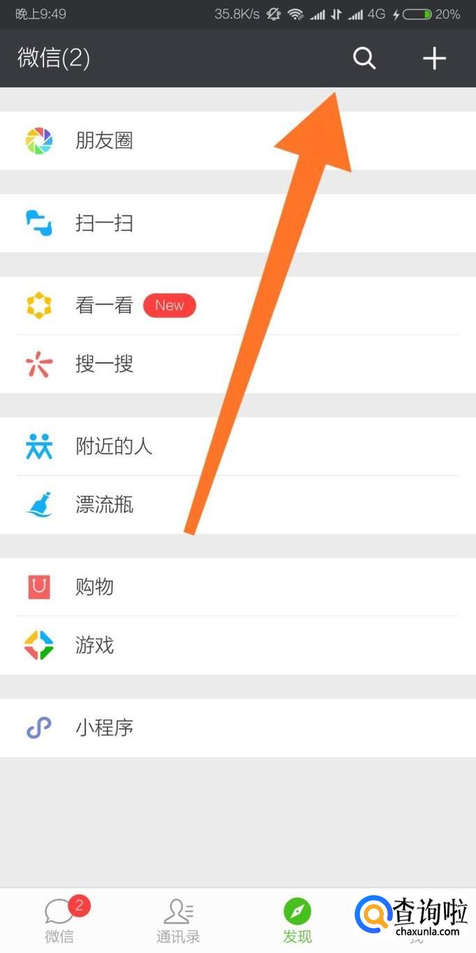 首先进入微信的发现页面,点击屏幕右上角的“搜索”图标。
