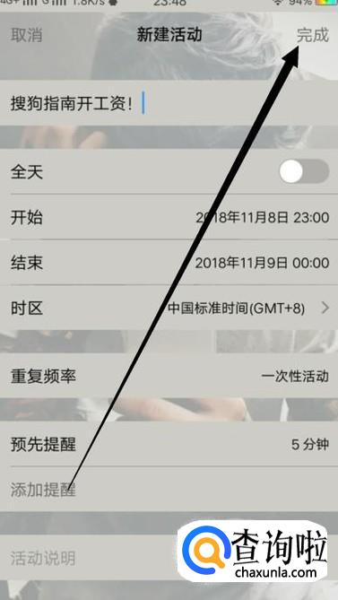打开之后,还可以设置预先提醒和活动说明等,设置好之后,点击“完成”即可,如图所示。