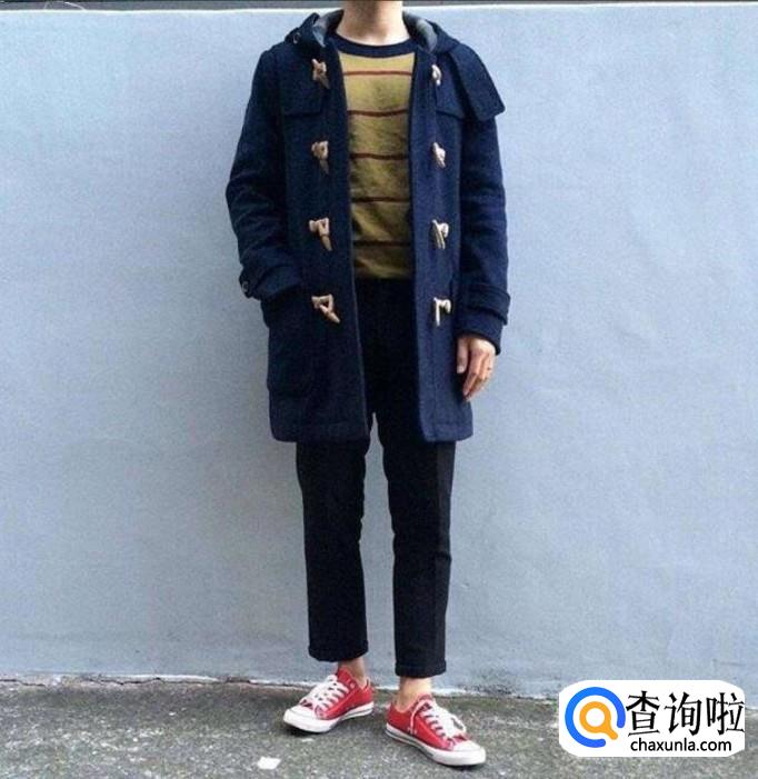 深蓝色的牛角扣大衣,里面搭配一件有小条纹的黄色底色的毛衣,裤子可以选择一条比较偏休闲风格的深色裤子,再搭配一双帆布鞋。