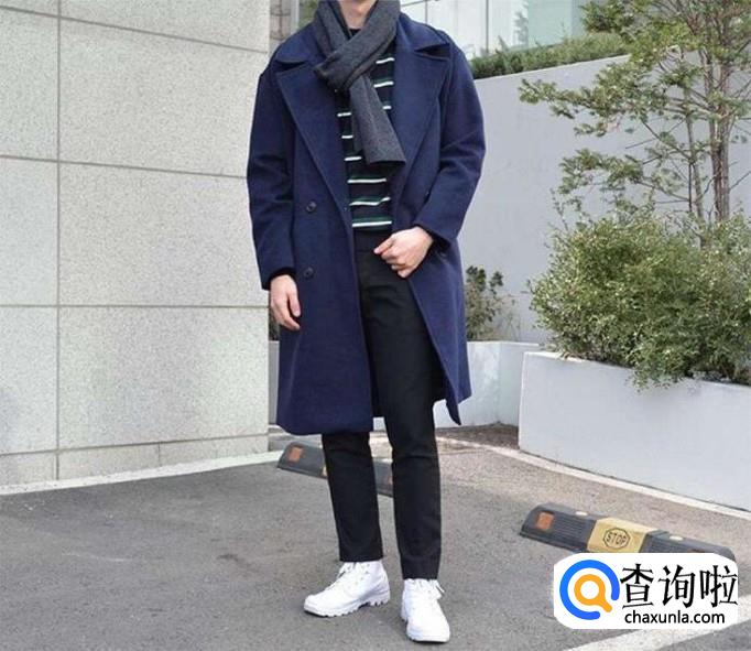 藏蓝色的呢大衣,里面搭配一件条纹的毛衣,下面再穿一条比较休闲的黑色裤子,再穿一双小白鞋,还可以戴一条灰色的围巾点缀一下。